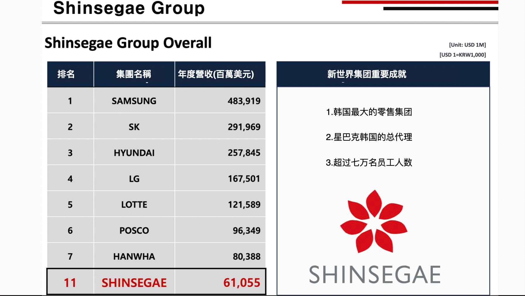 目前SHINSEGAE新世界为韩国最大零售业集团。